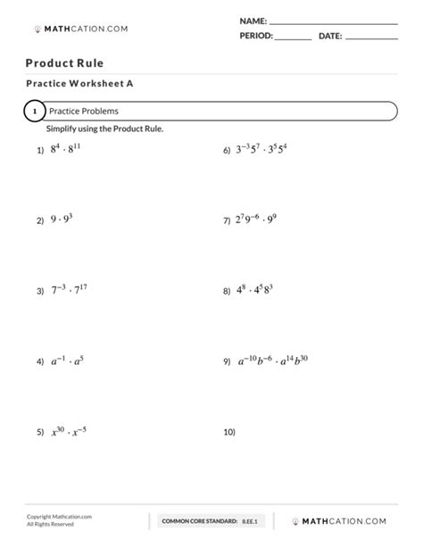 Bases must be the same. Web to recap, there are seven basic rules that explain how to solve most math equations that involve exponents. You must log in with an account or sign up to access this online worksheet! When multiplying variables with exponents, we must remember the product rule of exponents: To multiply two powers when the two bases are the same, write the base and add the exponents. Worksheet 4.1 product rule of exponents grade/level: Web the word product in math means what you get when you multiply things together. Product of powers rule —. To multiply when two bases are the same, write the base and add the exponents. If a factor is repeated multiple times, then the product can be written in exponential form \(x_{n}\).